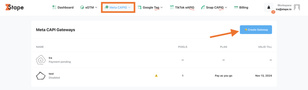 To use the Facebook Conversions API Gateway, you need a Stape account. If you don’t have one, follow the link to create it.