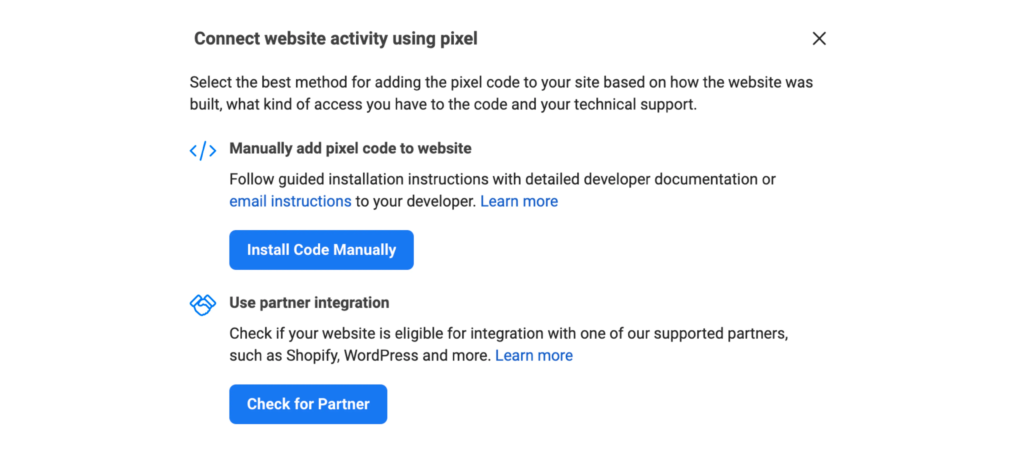For detailed instructions on how to set up Meta Pixel, please see Meta’s guide. |